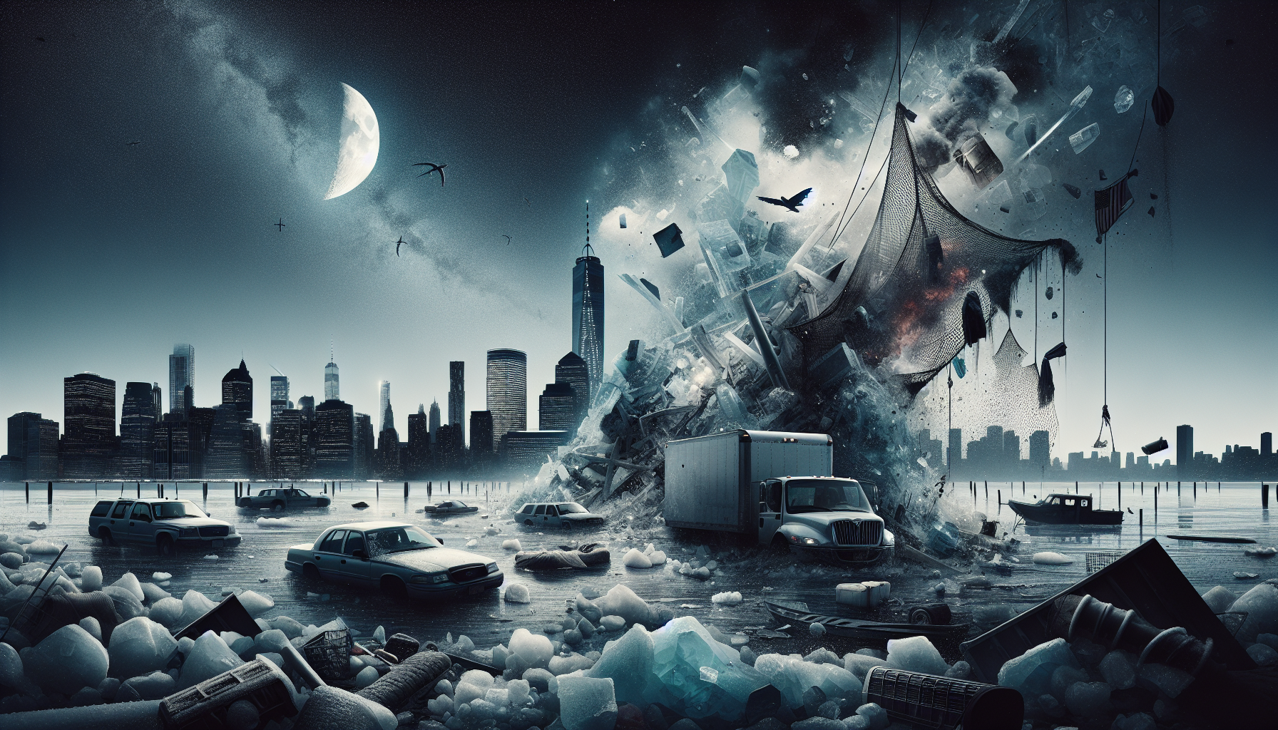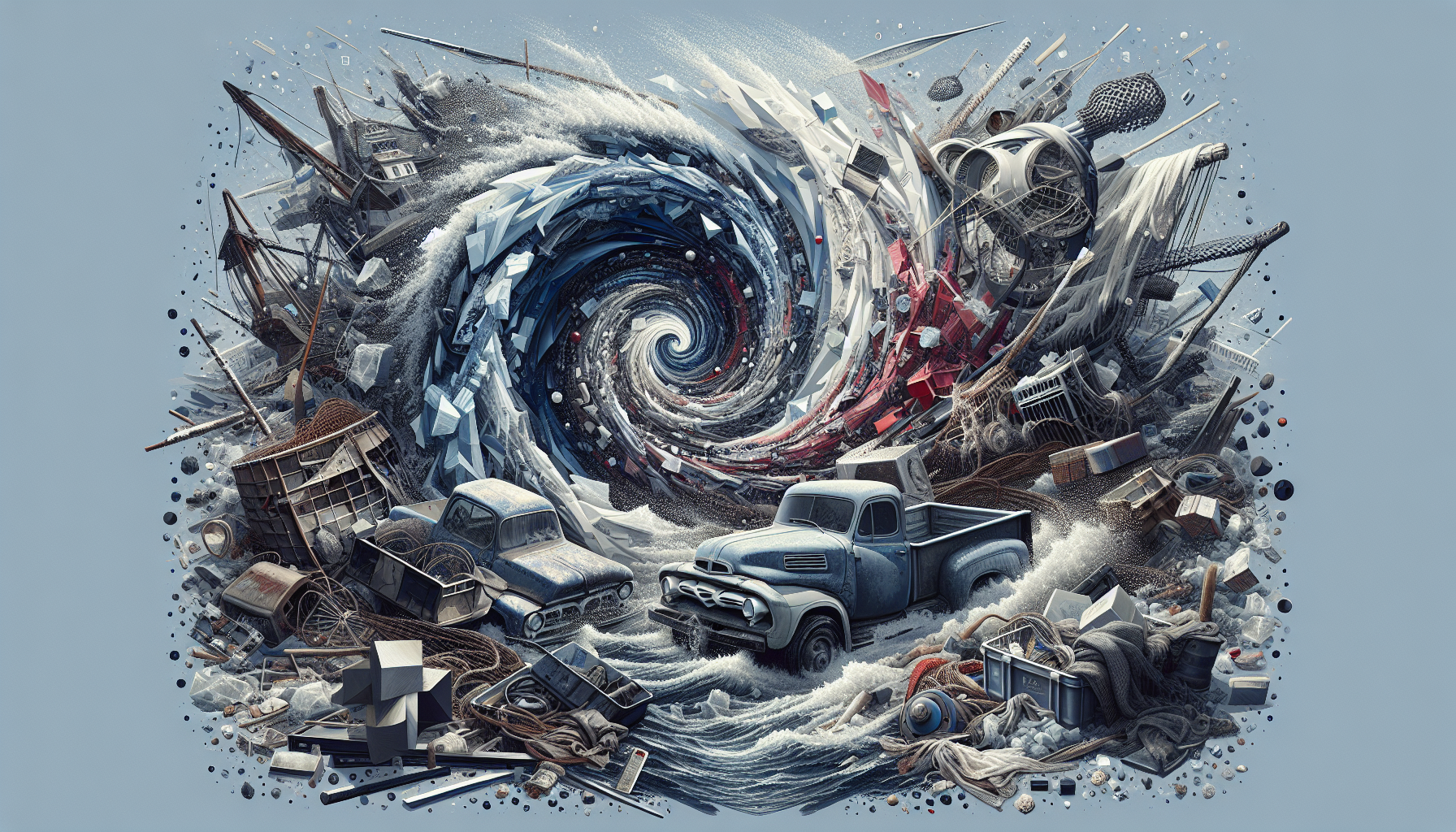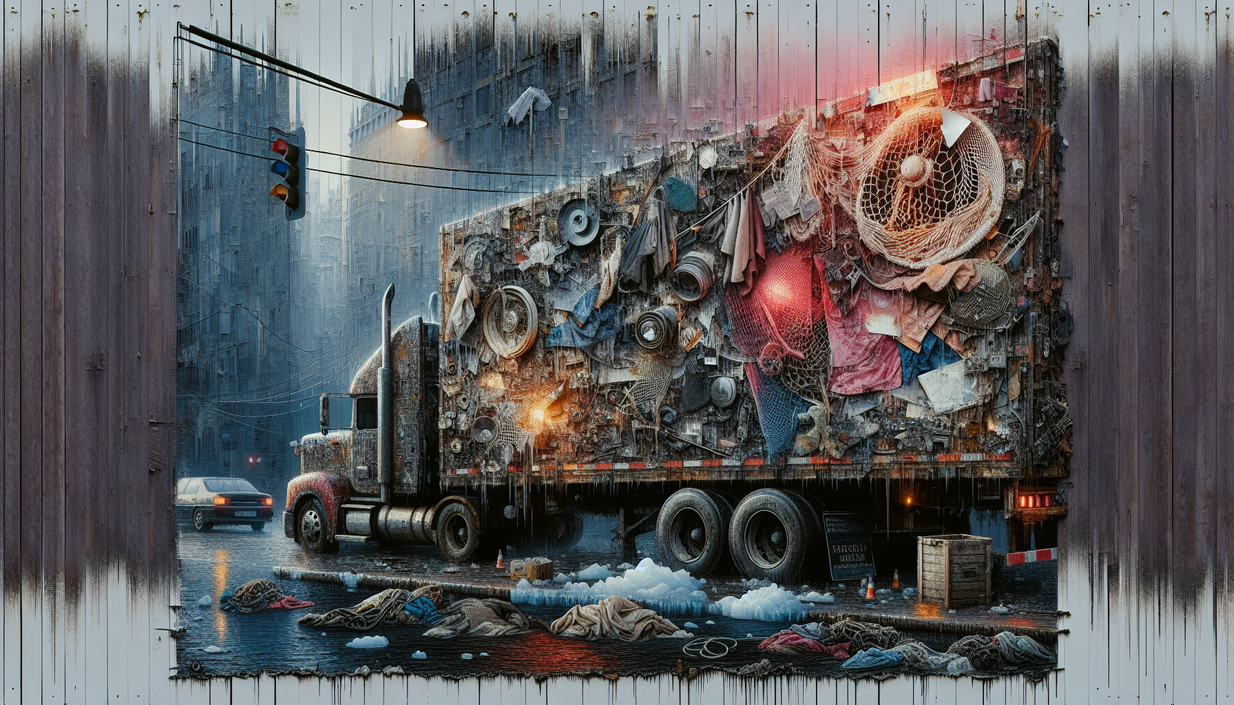 Oil-stiffened vintage clothes, truck headlight fragments, washed-up fishing net.