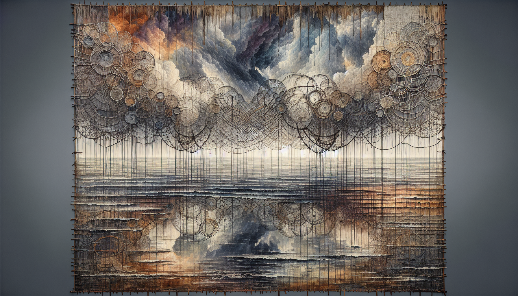 Recycled transmissions cables interwoven with harvest nets.