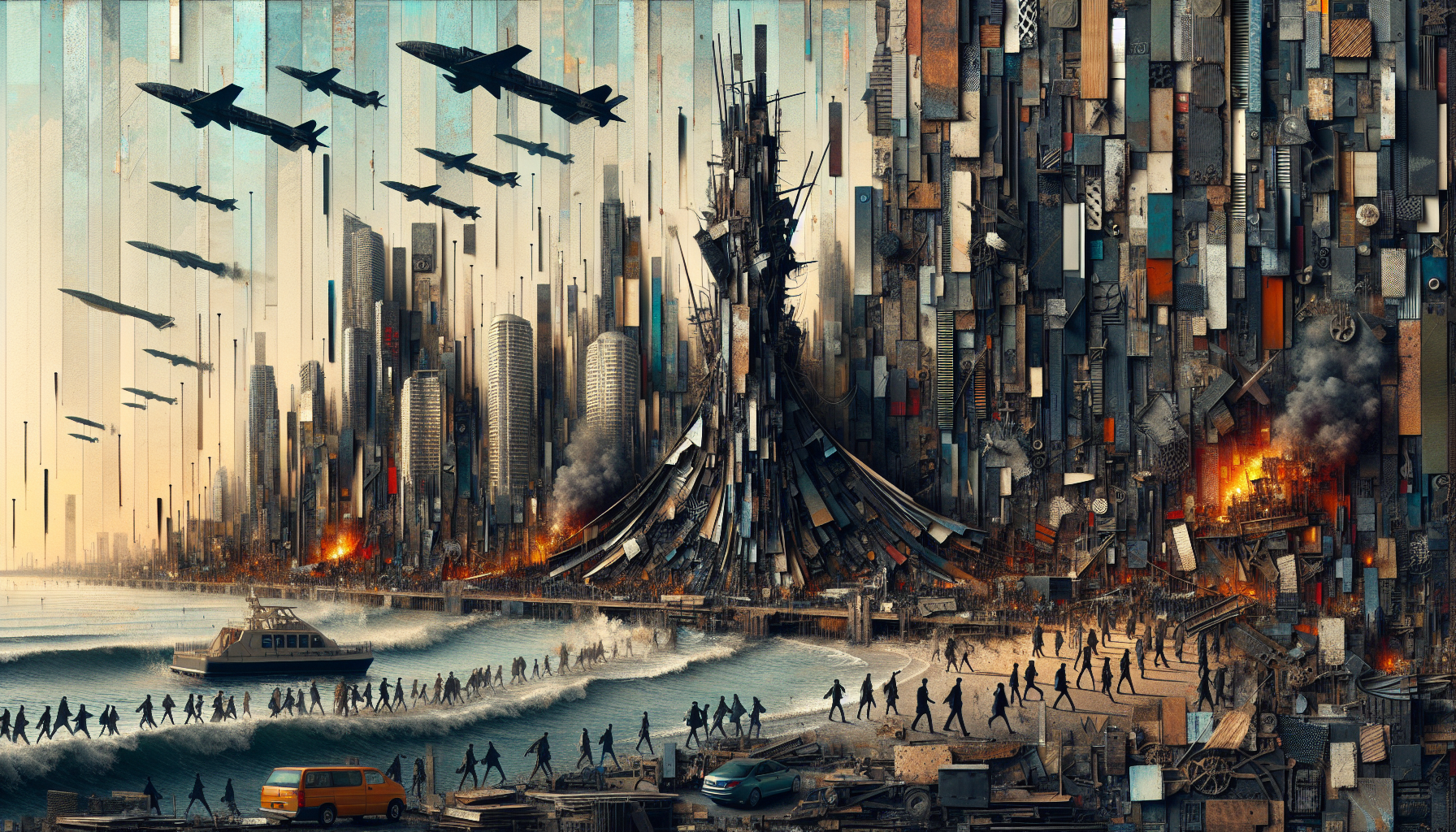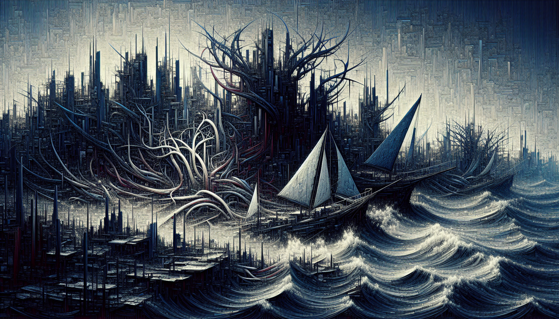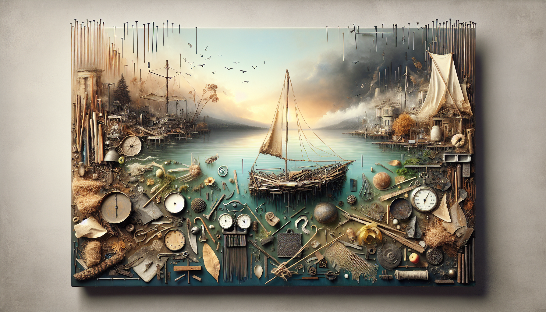 Discarded metal, driftwood, torn sails, old scales