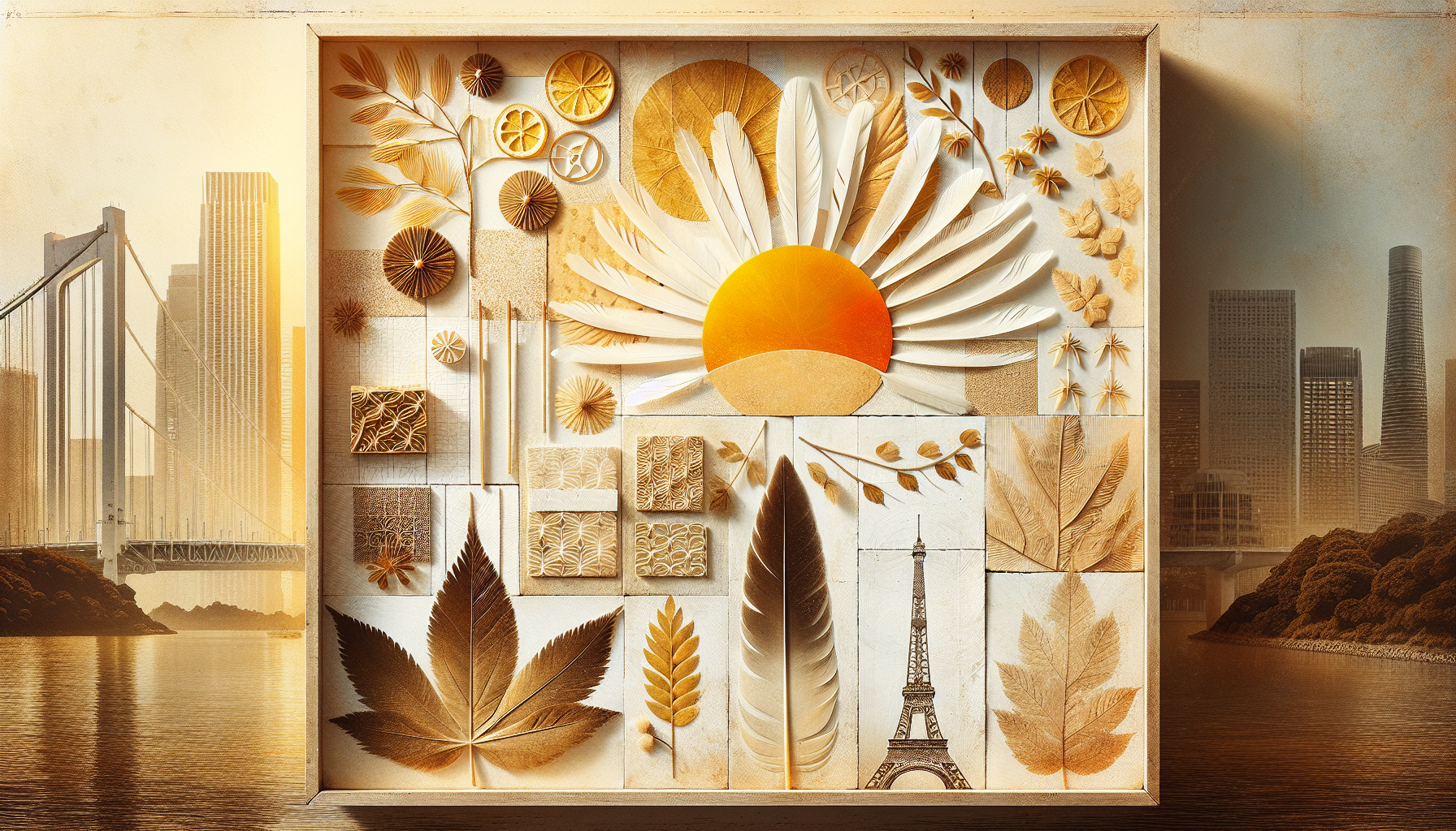 Collected feathers and sun-bleached leaves from the park; scraps of worn, faded fabric from discarded refugee tents.