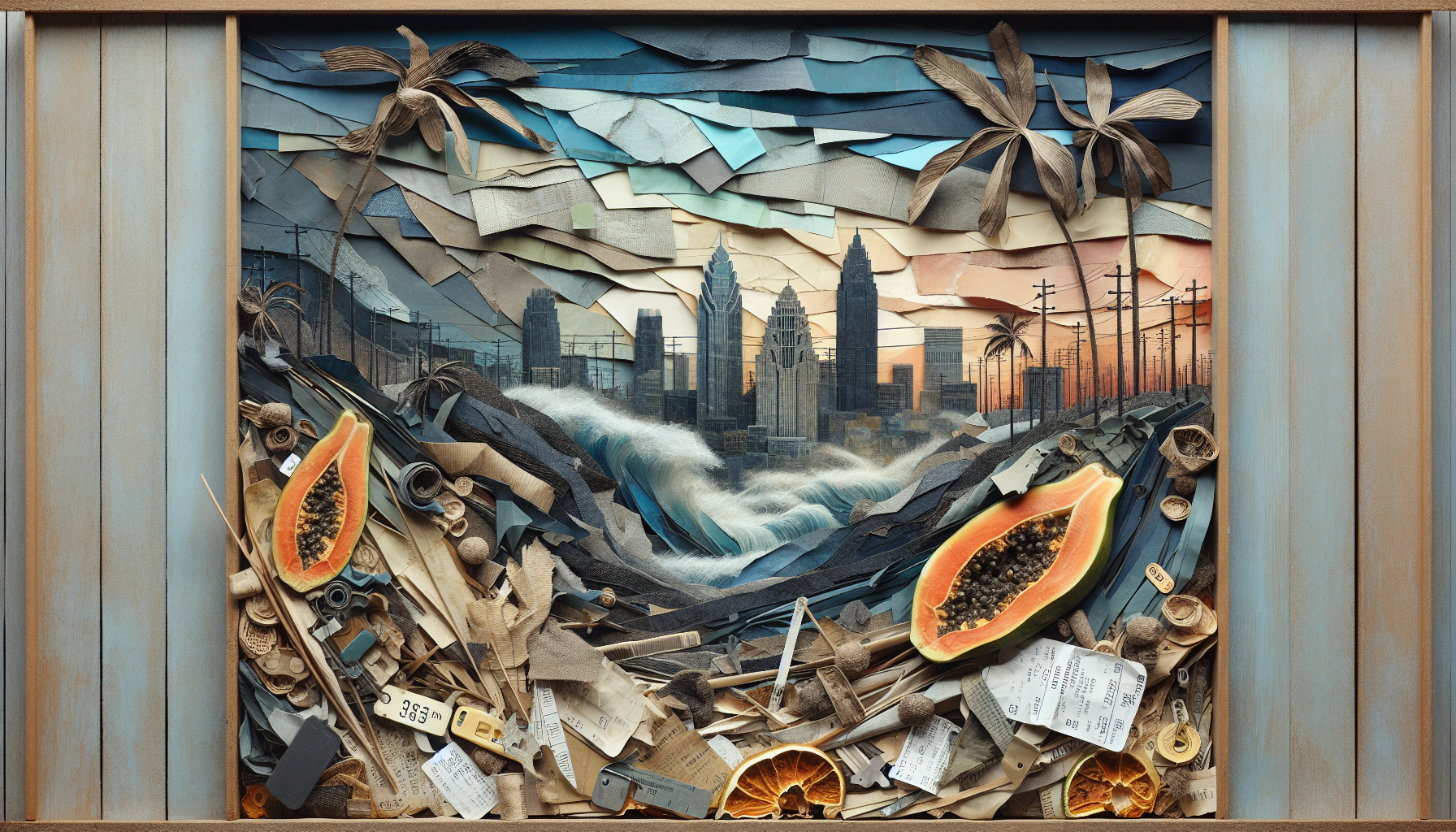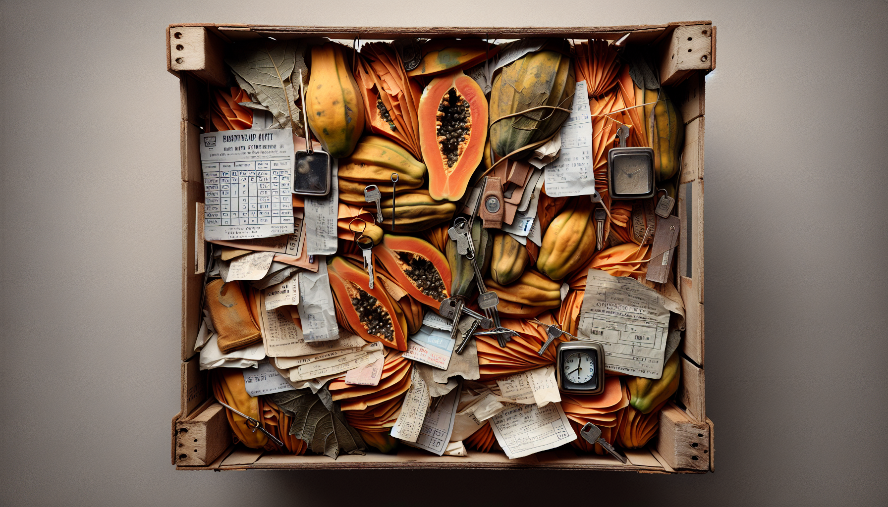Aged papaya skin, motel receipts, room keys, dried banana leaves.