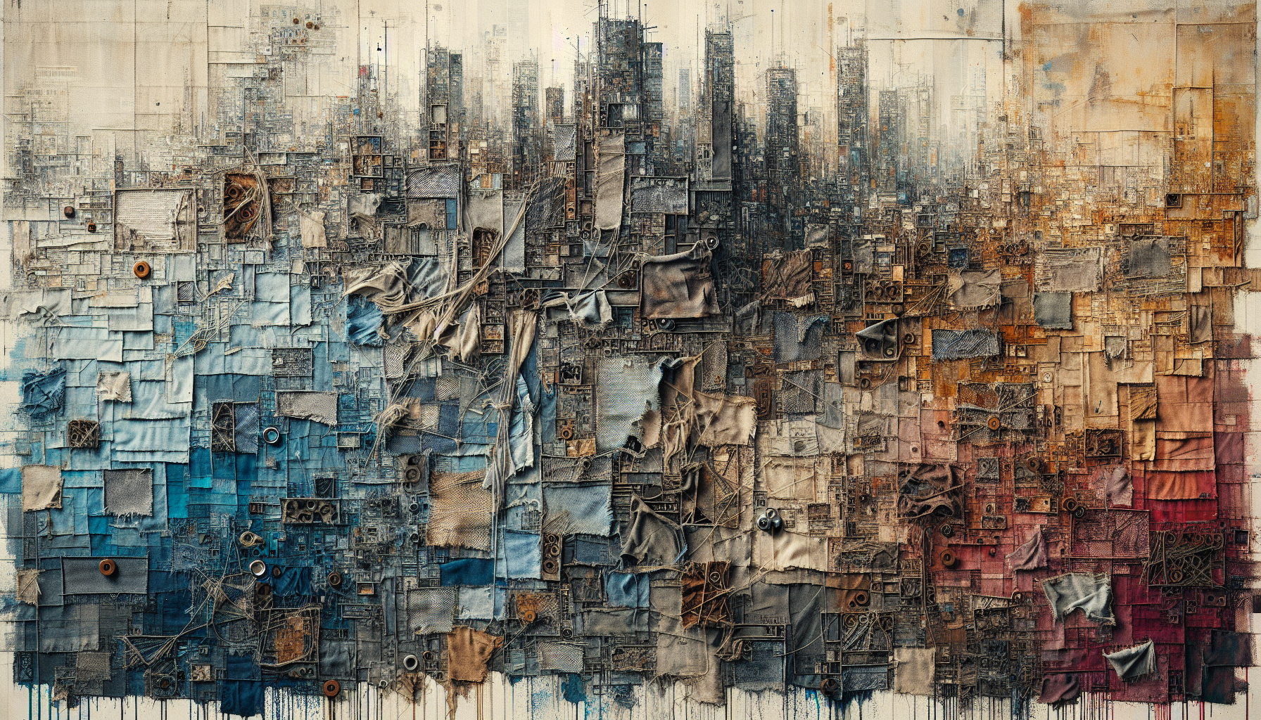 Denim scraps, tea-stained canvas, rusted metal fragments