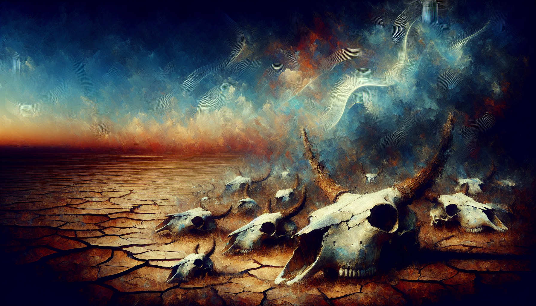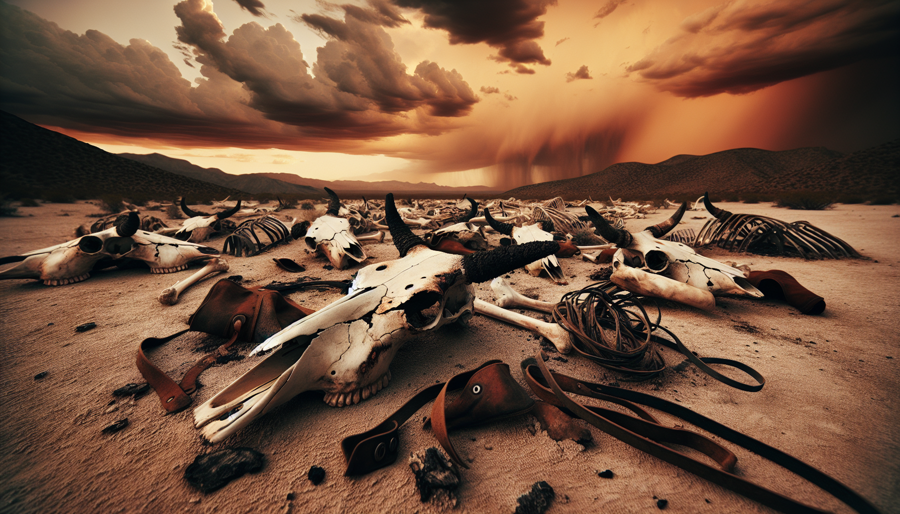 Ashen cattle bones, singed wire remnants, scorched leather straps, and rusty branding irons.
