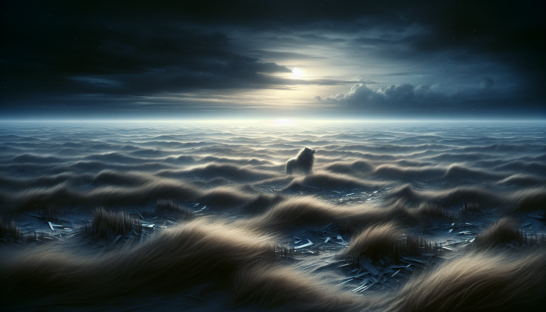 A mingled collection of lost dogs' fur, gleaming shards of broken glass reflecting moonlight, the forgotten essence of sun-stained paper hidden beneath sand.