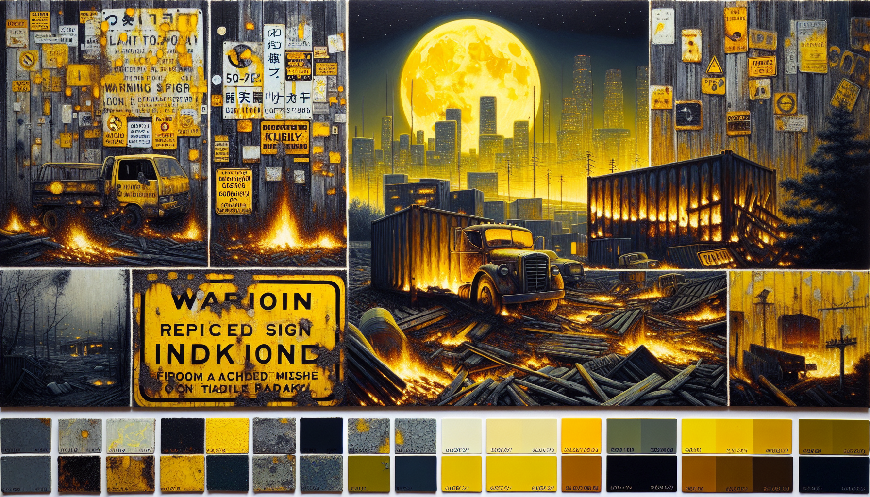 Warehouse warning signs, trailer park debris, leftover paints, rusted nails.
