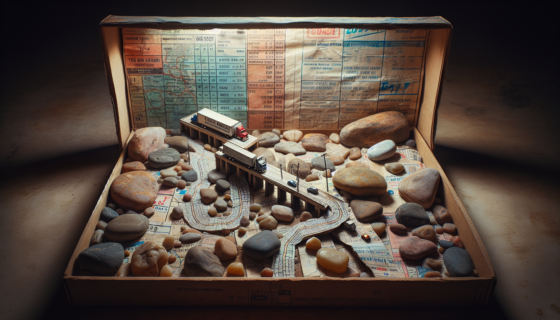 Old truck maps, fuel receipts, polished stones from riverbeds