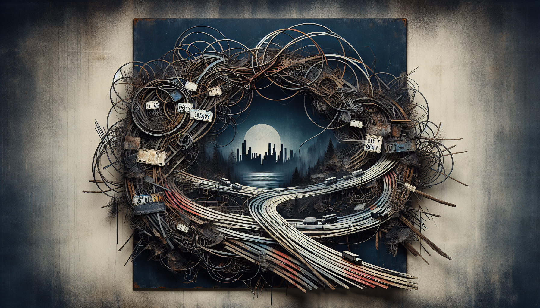 Rusted metal scraps, old license plates, bits of driftwood, stray wires