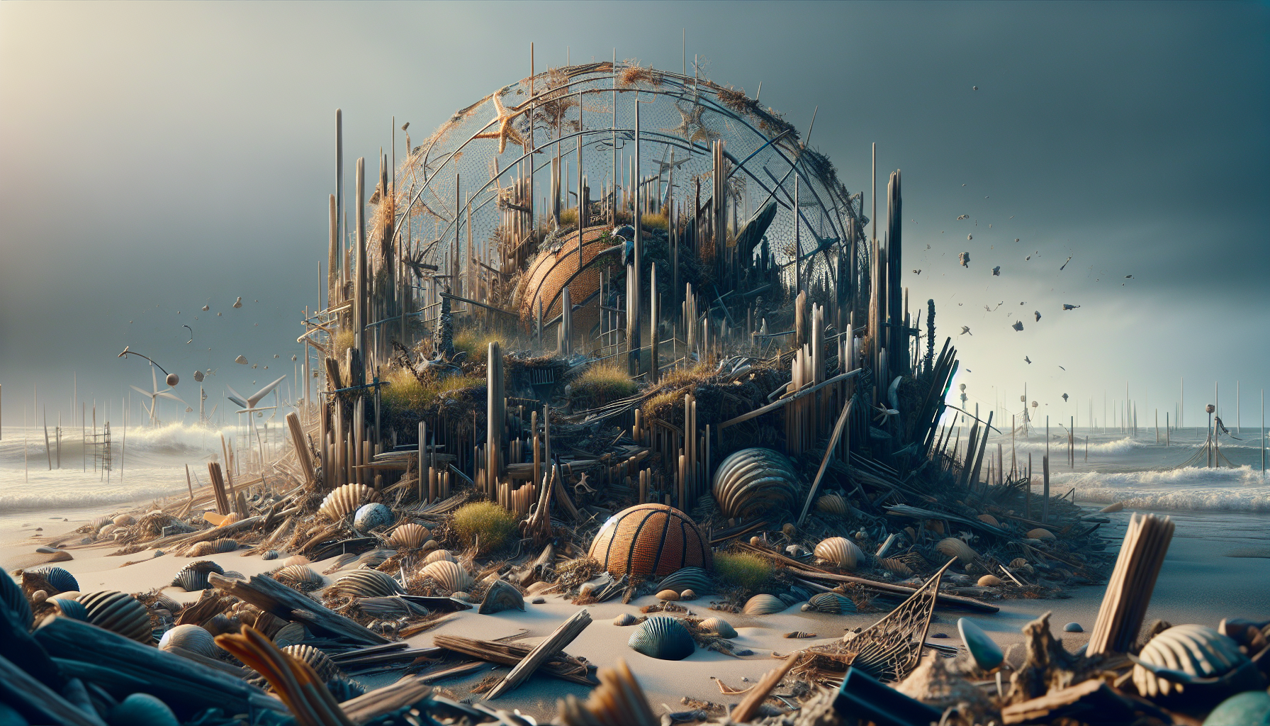 Broken shells, driftwood, rusted metal scraps