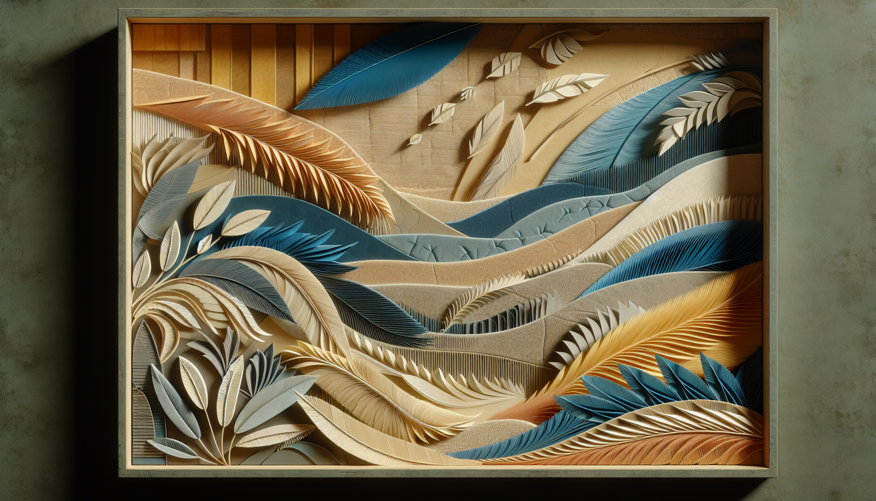 Pressed and carefully arranged feathers and leaves in shadow boxes.