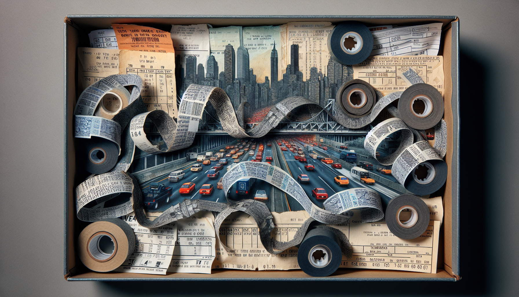 Collages of toll receipts and aged tape