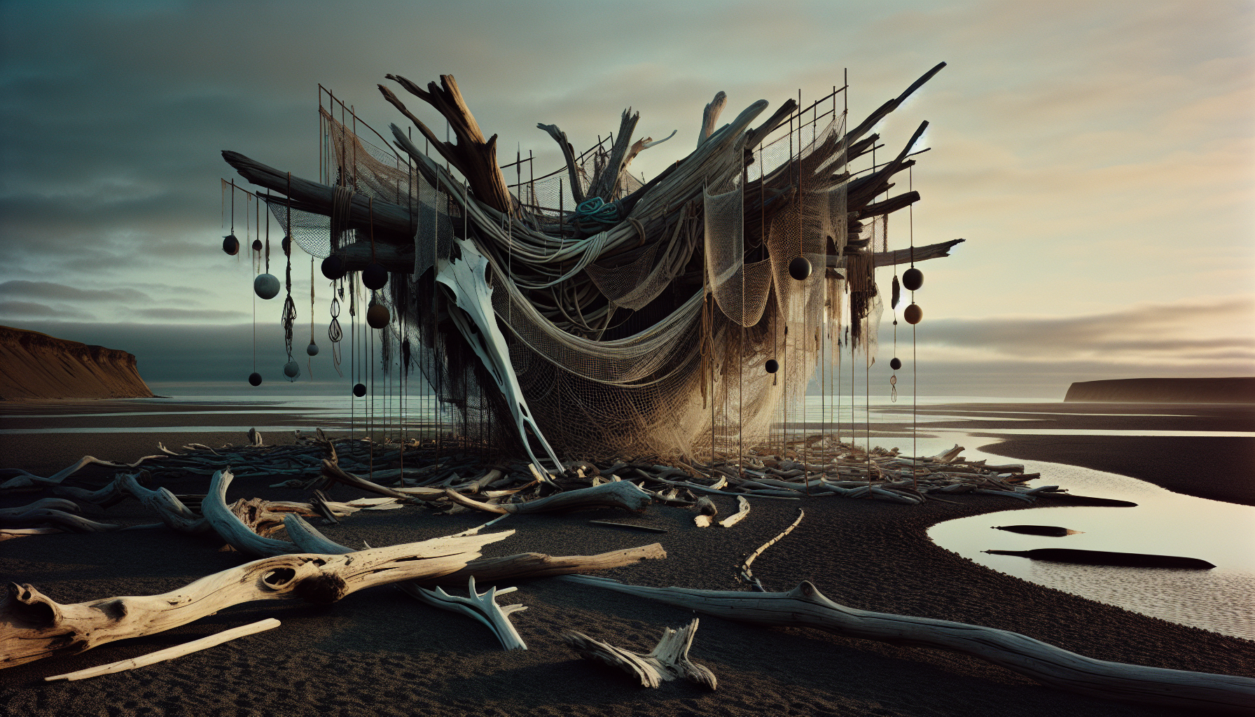 Sea-salvaged fishnets, fragments of sailor's rope, bones from sea creatures
