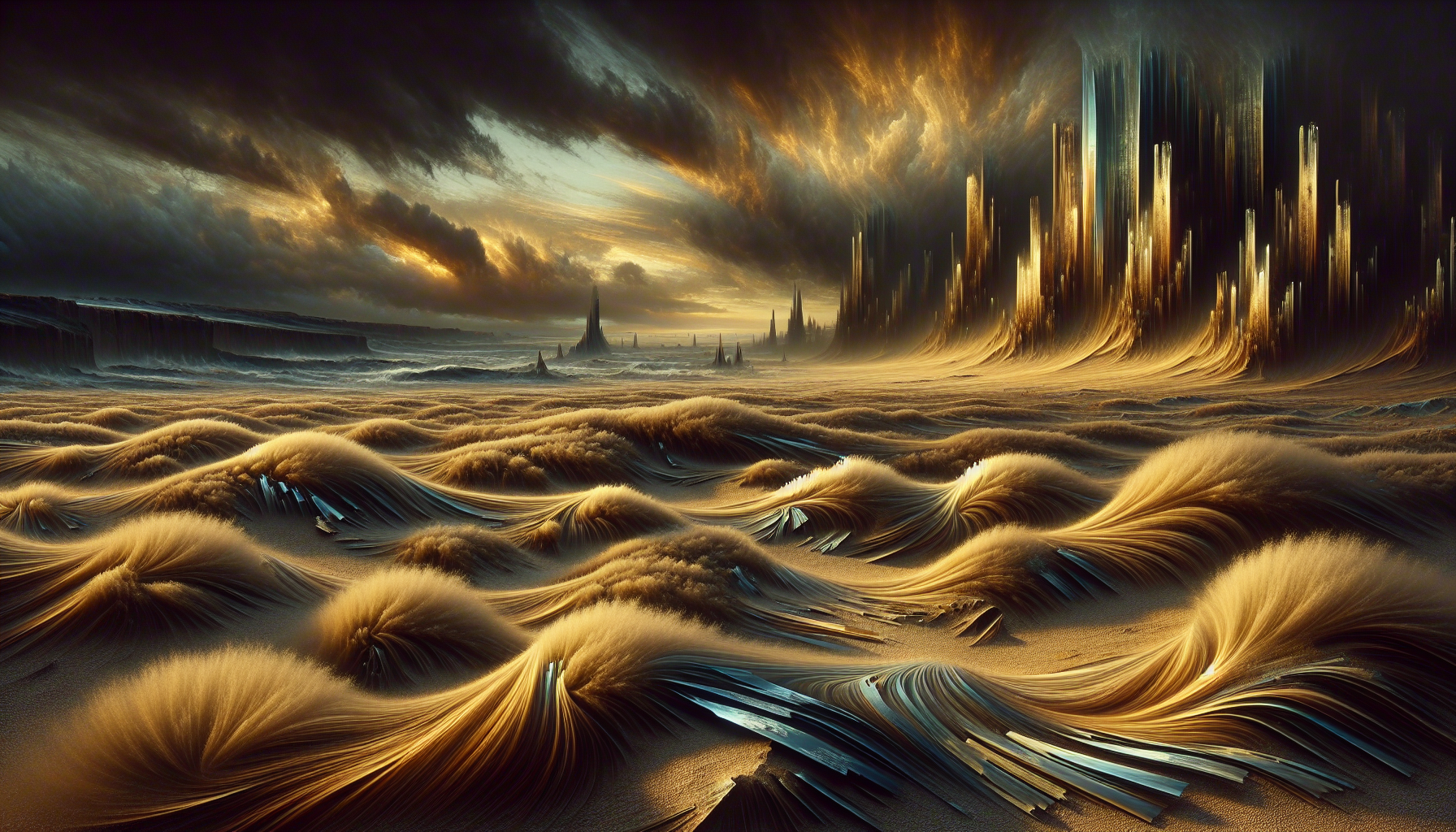 A mingled collection of lost dogs' fur, gleaming shards of broken glass reflecting moonlight, the forgotten essence of sun-stained paper hidden beneath sand.