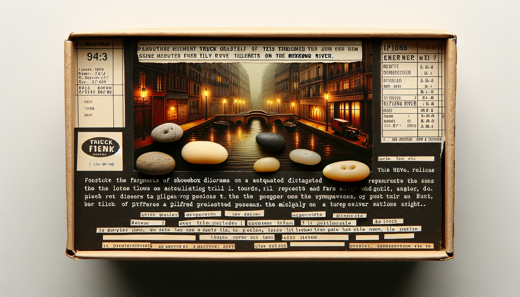 Old truck maps, fuel receipts, polished stones from riverbeds