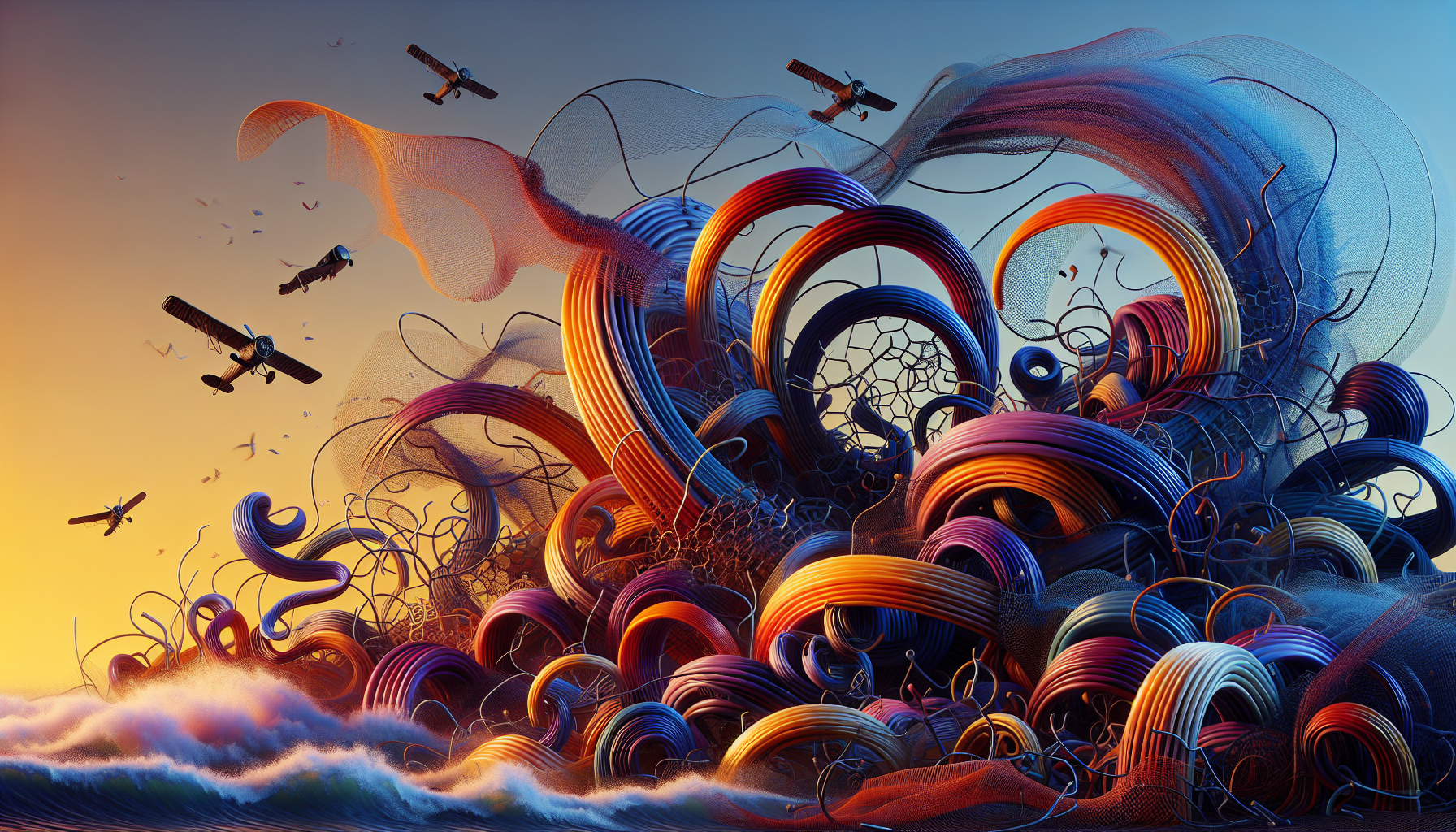 Discarded plane parts, twisted vineyard wire, leftover spray nozzles