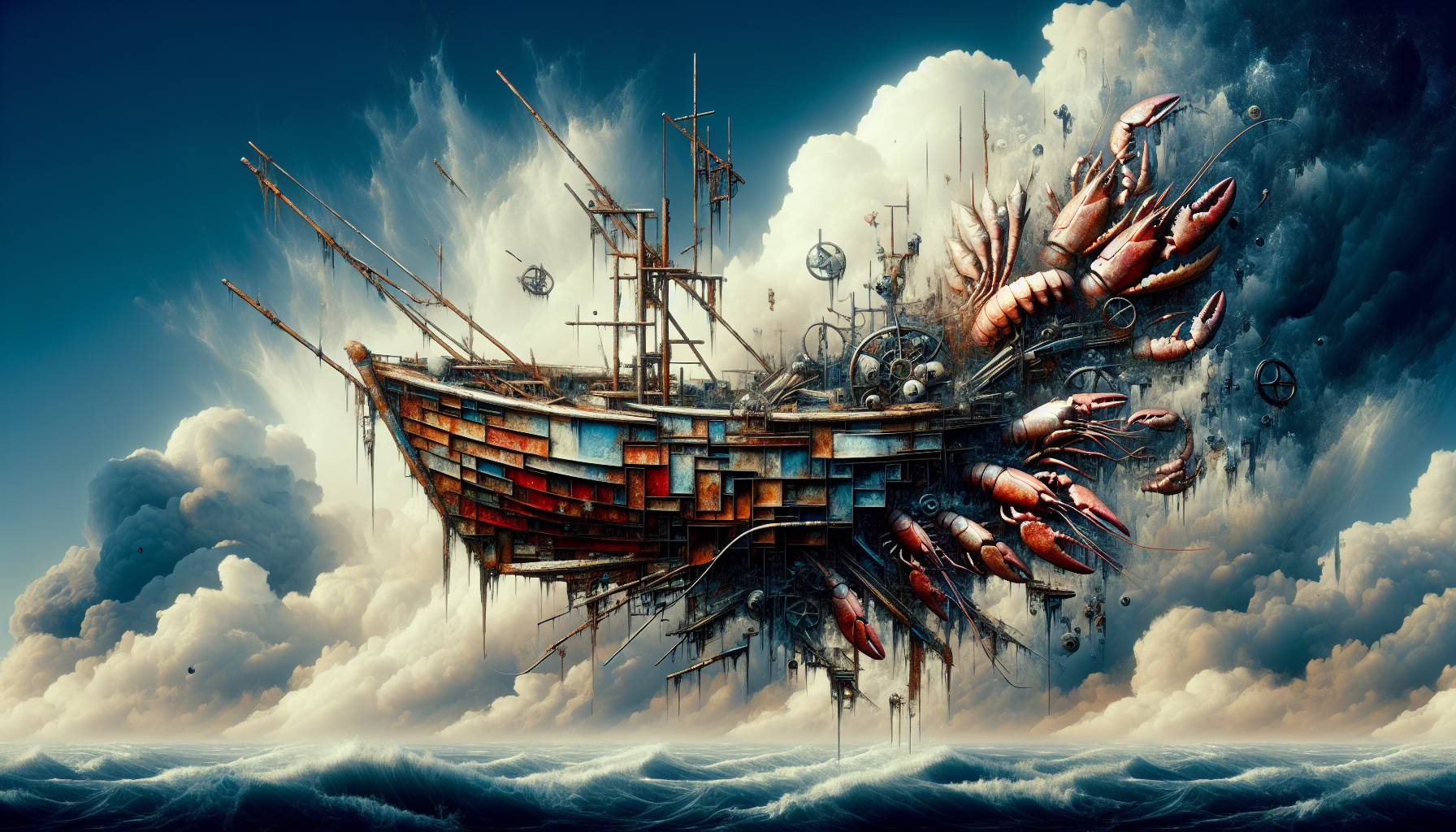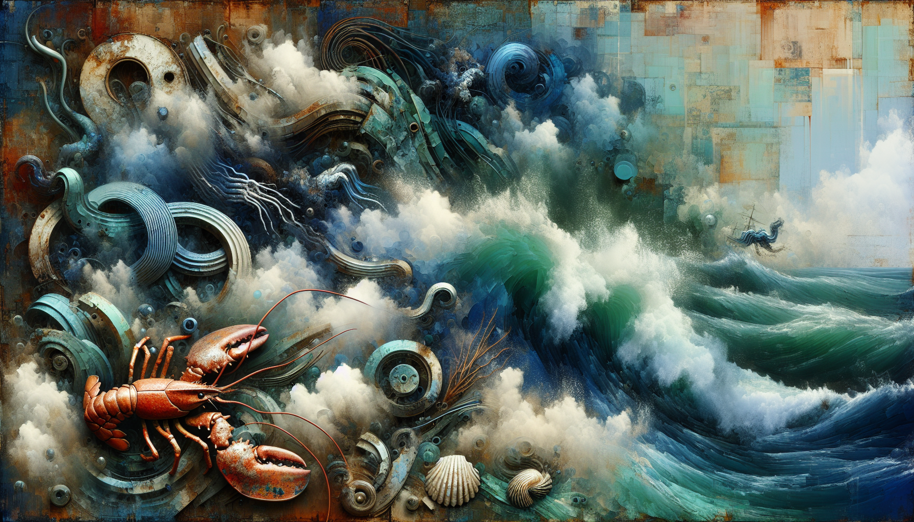 Corroded metal fragments, lobster carapaces, sunken detritus